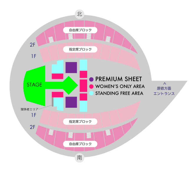 ※アリーナのスタンディング(自由エリア)のランウェイ沿いピンク色のエリアは女性専用となります。男性がご入場いただけないエリアとなります。予めご了承ください。